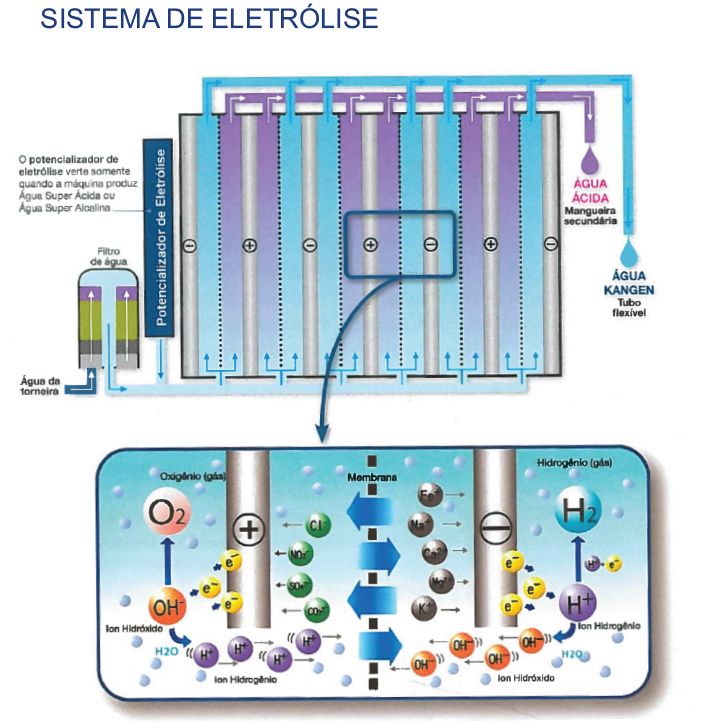 A máquina KANGEN é formada por 7 placas de eletrodos, sendo 4 negativas e 3 positivas. Estas placas estão dispostas alternadamente formando 6 compartimentos. Entre cada uma das placas, existem membranas com pequenos orifícios que permitem a passagem apenas dos minerais que são atraídos pelos eletrodos. Os minerais positivos são atraídos pelos eletrodos negativos formando, assim a Água KANGEN.